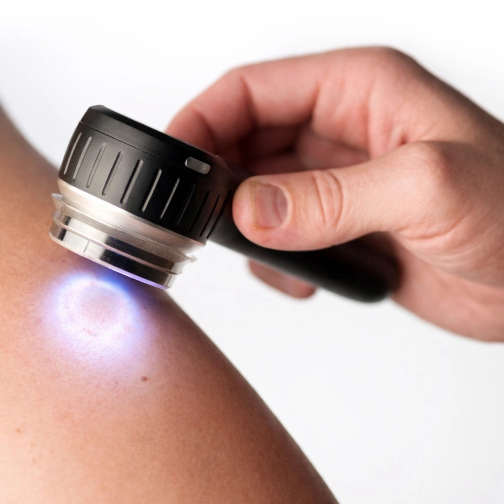 Anamnese, queixa principal e exame clínico da pele (com dermatoscopia quando indicado).